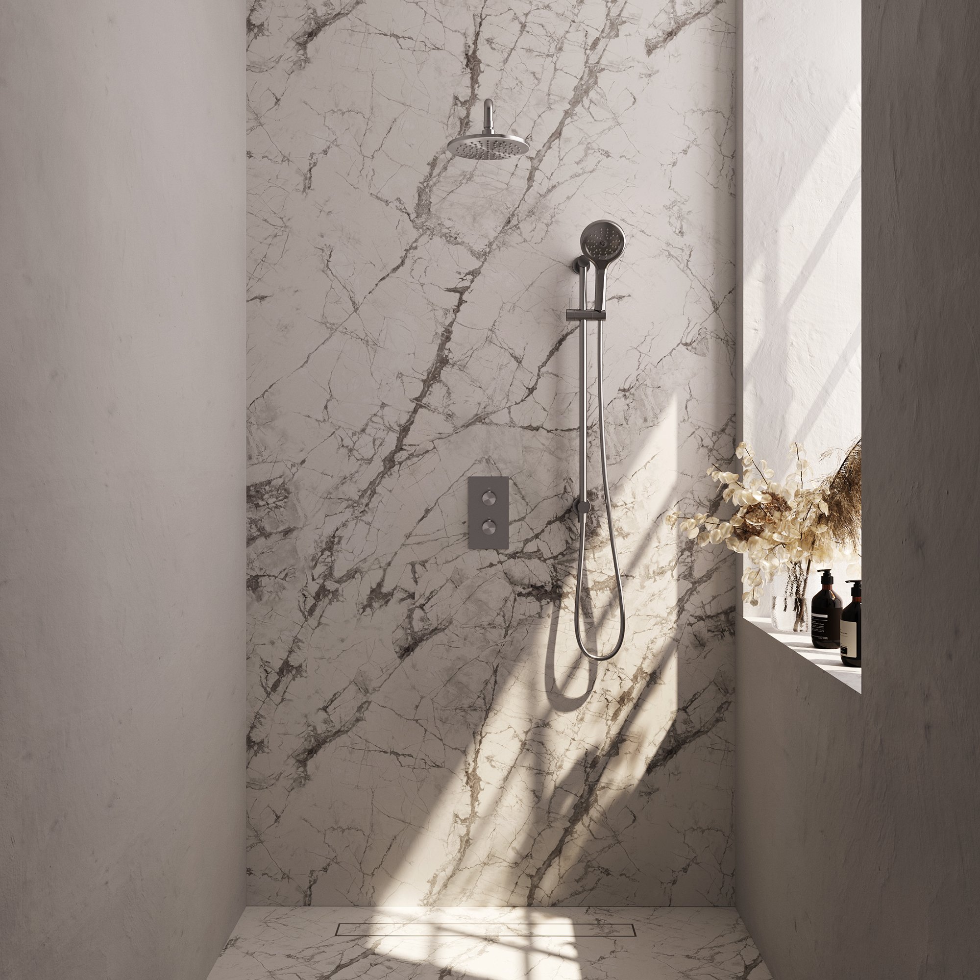 - Wegens de gunmetal afwerking is de douche krasbestendig en duurzaam