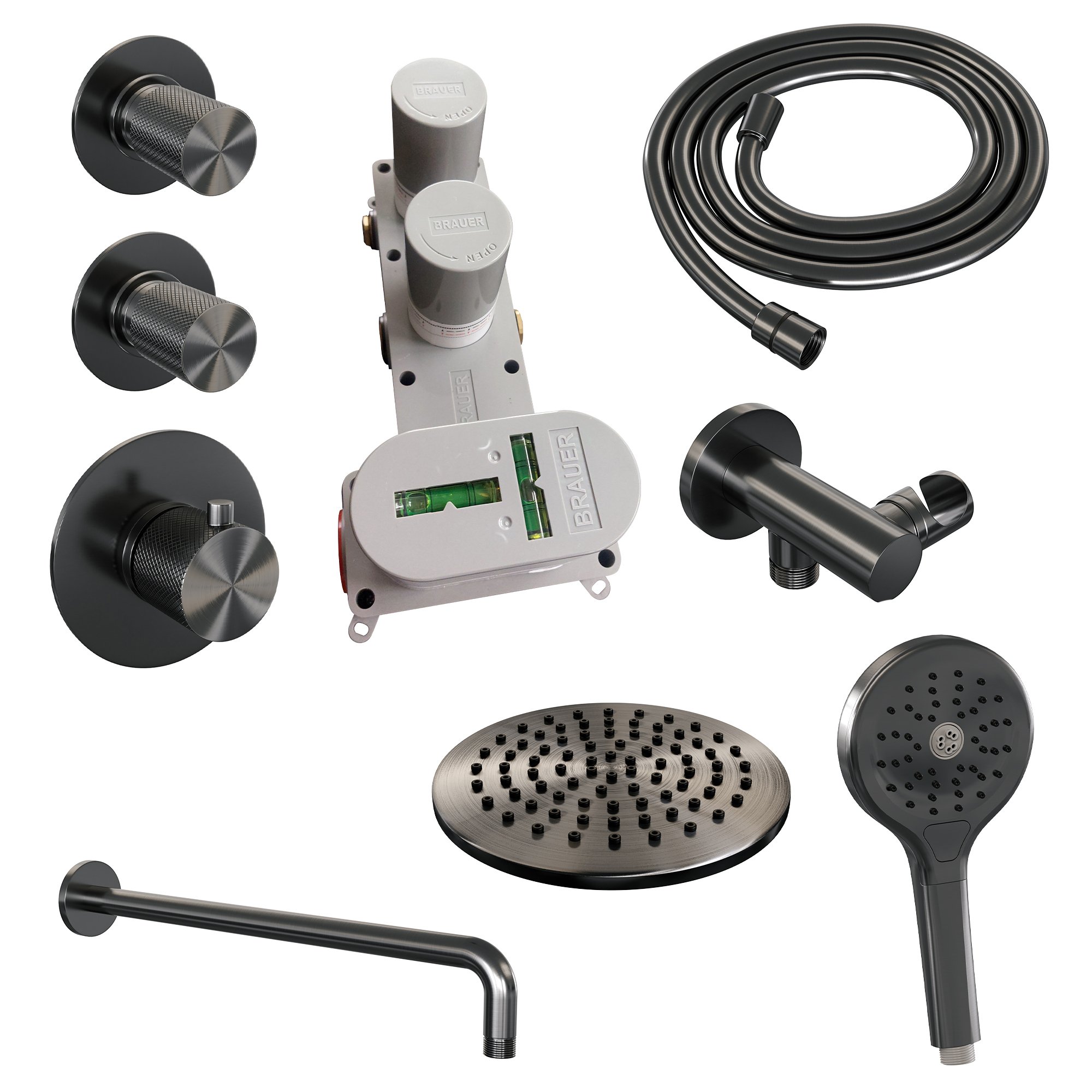 Brauer Gunmetal Carving Inbouw Doucheset – 3-Standen Handdouche Rond – 20 cm Hoofddouche – Gebogen Wandarm – 5-GM-105