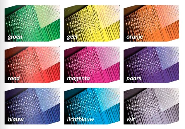 | Kleur Lichtbron | Blauw, Groen, Oranje, Rood, Geel, Wit, Magenta, Paars, Lichtblauw |