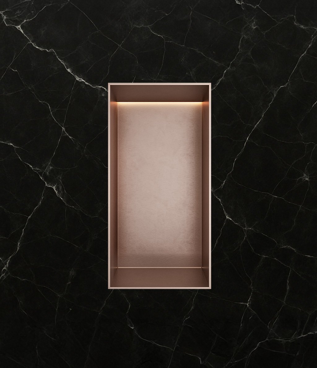 De inbouwnis is afgewerkt met een hoge kwaliteit geborsteld koper PVD, wat zorgt voor een tijdloze look. De unieke LED-verlichting creëert een sfeervolle uitstraling, terwijl de afmetingen van 30x15x10cm voldoende ruimte bieden voor al uw badkamerbenodigdheden.