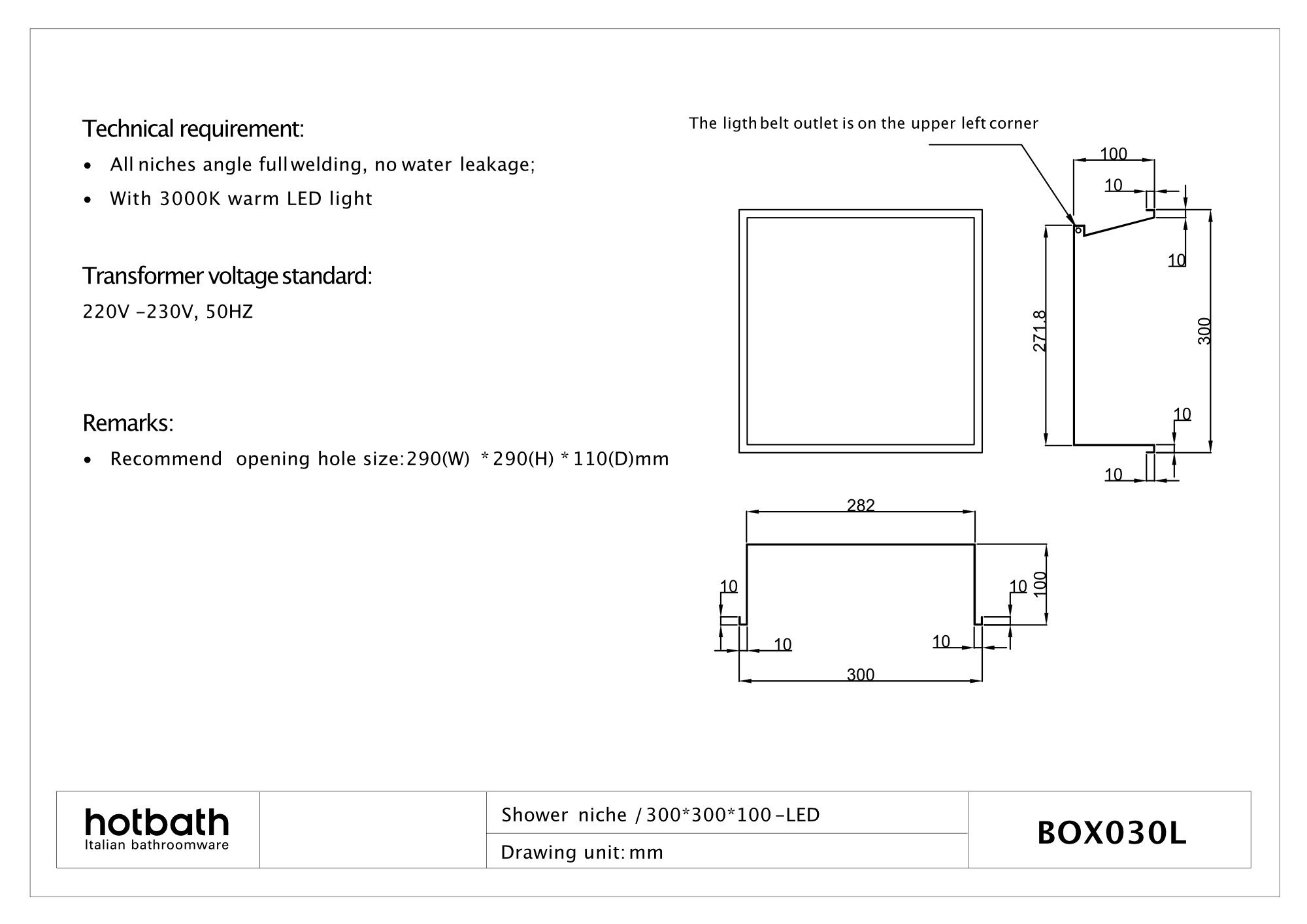 Hotbath &More inbouwnis 30x30x10cm – met frame – LED verlichting – RVS 316 – BOX030LIX