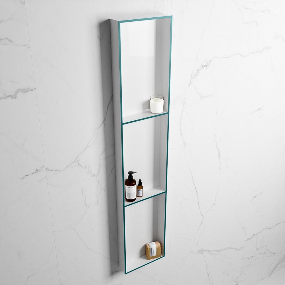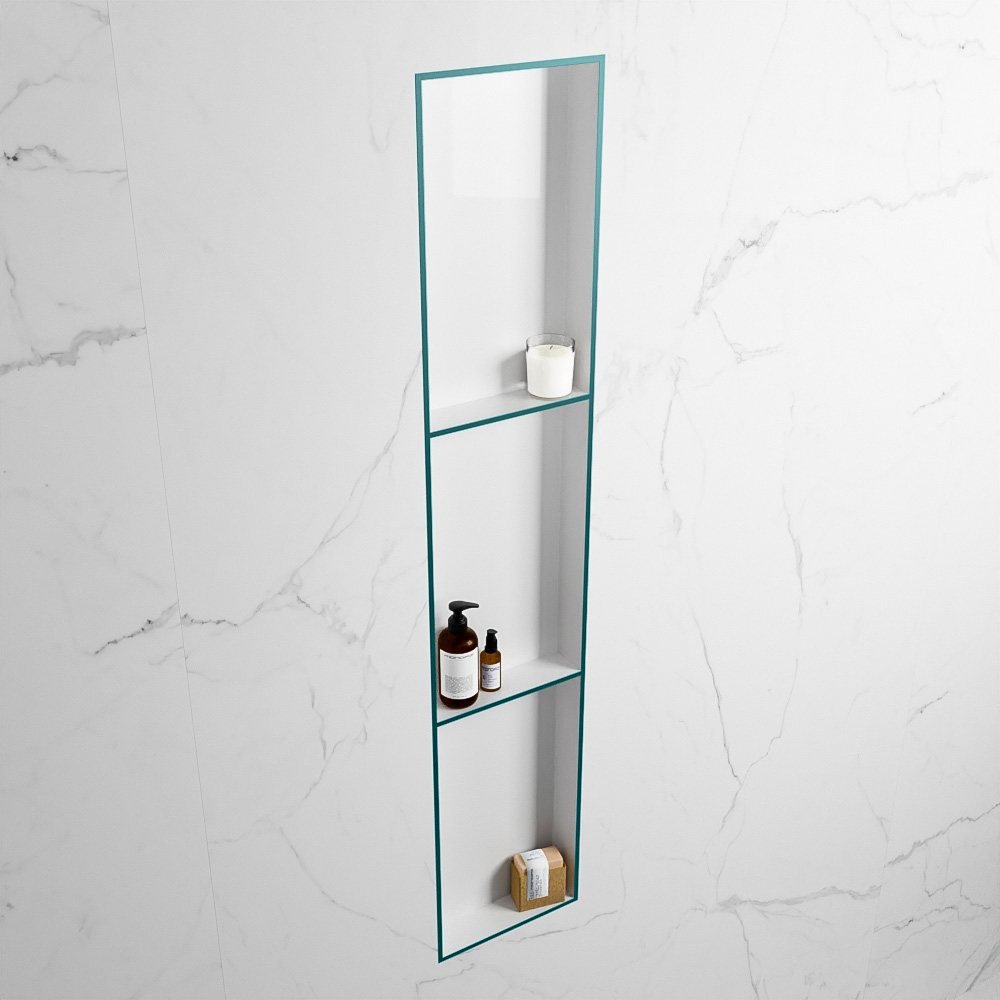 Dankzij de in/opbouw montagevorm is deze nis flexibel in gebruik en eenvoudig te installeren. De nis is 149.5 cm lang en 29.5 cm breed, waardoor het een ideale oplossing is voor zowel kleine als grote badkamers. De drie vakken bieden voldoende ruimte voor al uw badkamerbenodigdheden, van douchegel en shampoo tot handdoeken en accessoires.