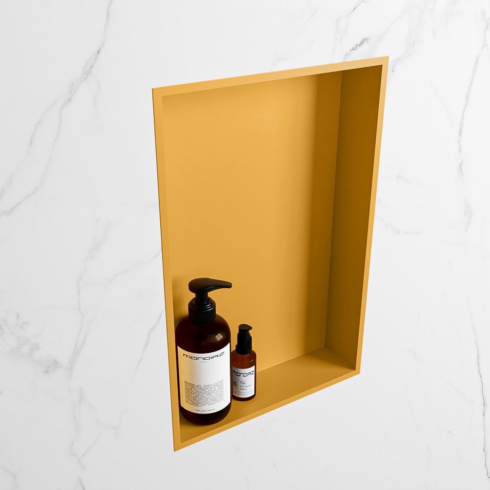 Deze nis is niet alleen praktisch, maar ook stijlvol. De ocher (geel) kleur is zowel levendig als warm, waardoor uw badkamer een unieke uitstraling krijgt. Of u nu een kleurrijke badkamer wilt creëren of gewoon een vleugje kleur wilt toevoegen aan een neutraal kleurenschema, deze nis is een fantastische keuze.