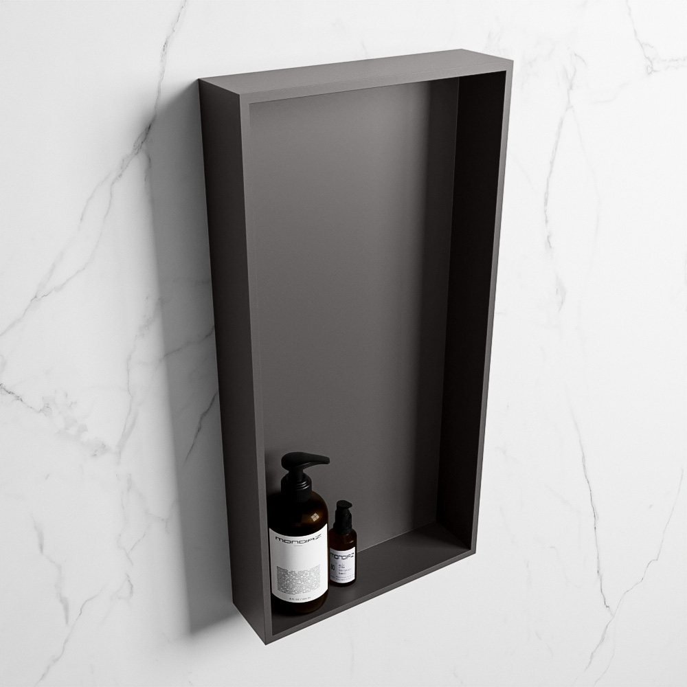 Deze nis is uitgevoerd in donkergrijs solid surface, een duurzaam en sterk materiaal dat bekend staat om zijn onderhoudsgemak. Het donkergrijze kleurenschema geeft uw badkamer een luxe uitstraling en past bij verschillende interieurstijlen. Met zijn strakke lijnen en moderne vormgeving is de Mondiaz EASY Nis een ware blikvanger in uw badkamer.