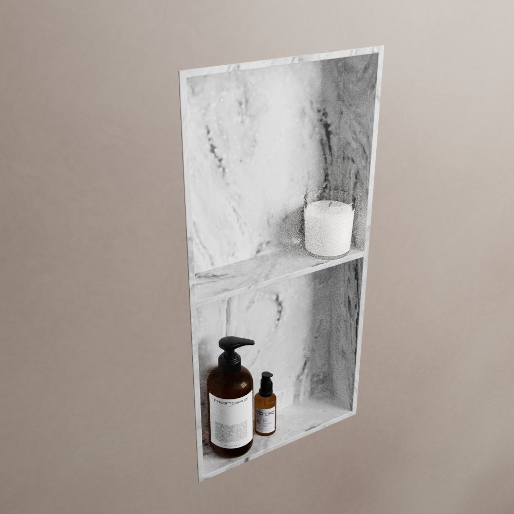 De pastelkleurige Glace afwerking van deze nis voegt een subtiele, maar stijlvolle touch toe aan uw ruimte. Het verhoogt niet alleen de esthetische waarde van uw badkamer, maar zorgt ook voor een rustgevende sfeer. Bovendien zijn de twee vakken van dit product ideaal voor het opbergen van uw badkamerbenodigdheden, van zeep tot handdoeken en meer.