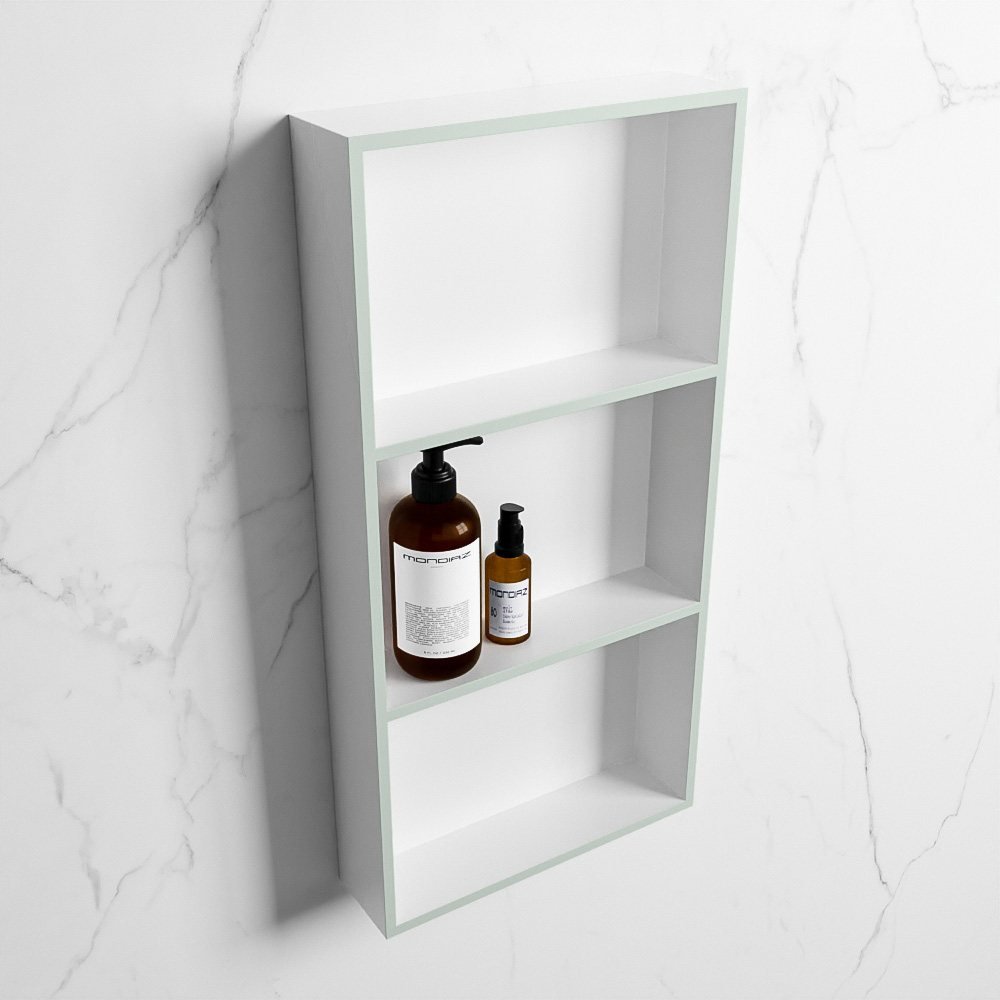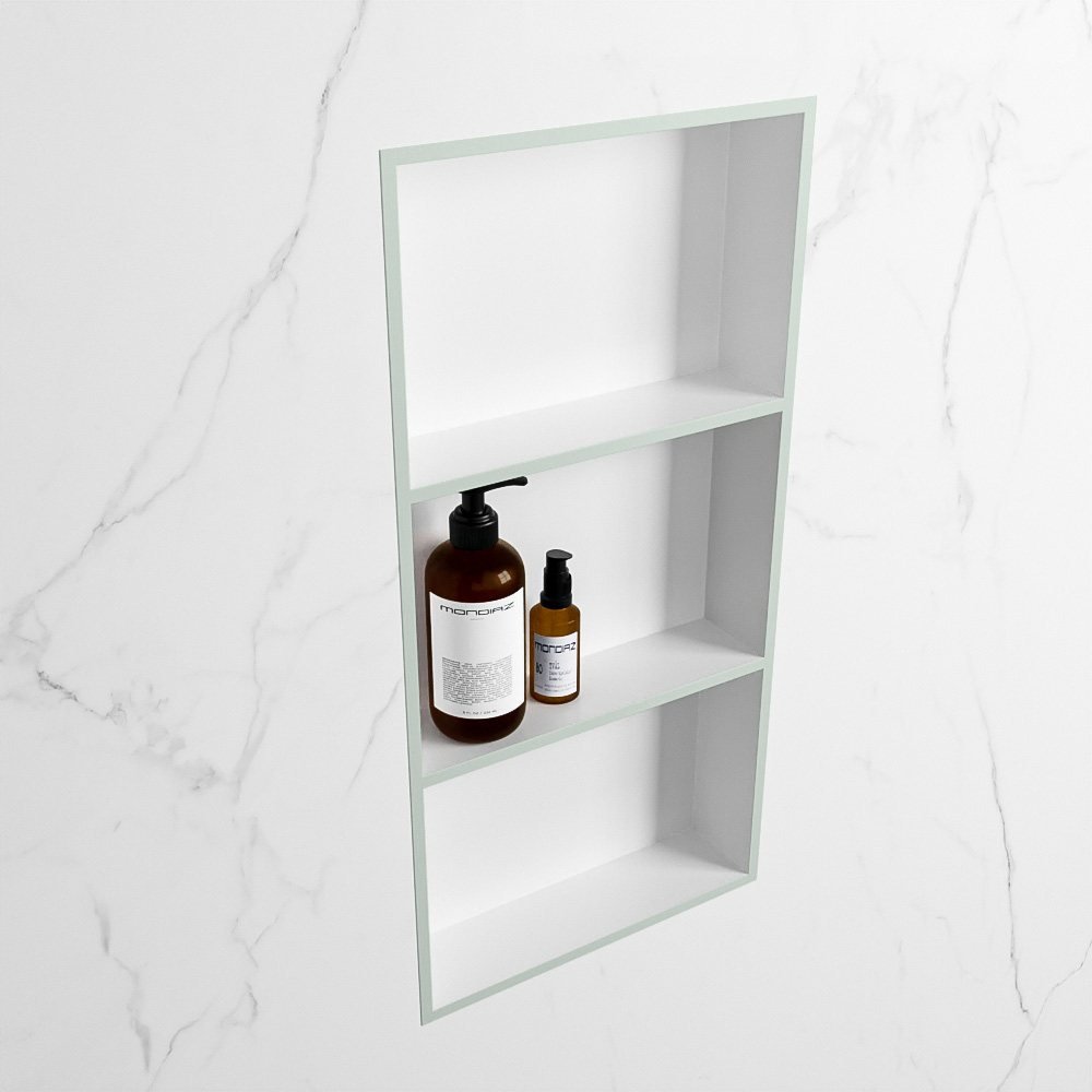 Met zijn unieke licht pastel groene en matte witte kleurstelling, geeft deze nis een frisse en moderne touch aan uw badkamer. De subtiele kleurencombinatie maakt het makkelijk om te passen in verschillende interieurstijlen – van minimalistisch tot eigentijds.