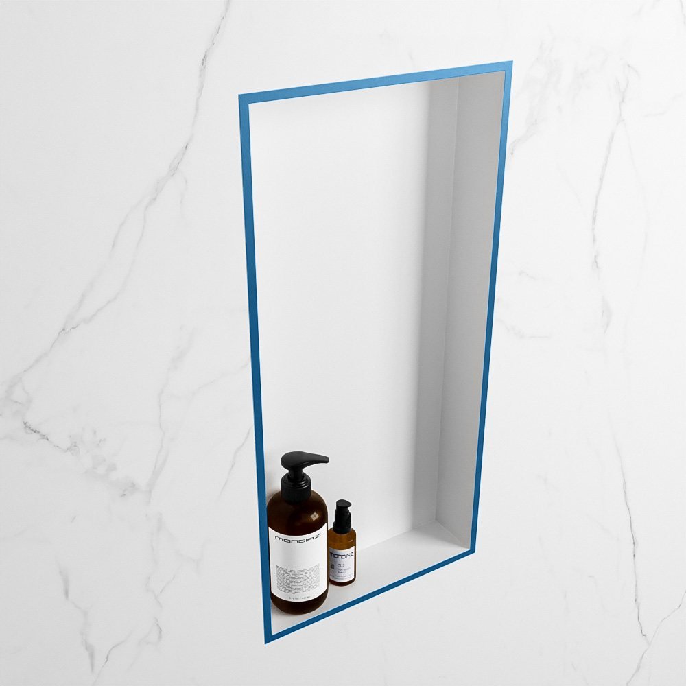 Gemaakt van hoogwaardig Solid Surface materiaal, deze nis is niet alleen een stijlvolle aanvulling op uw badkamer, maar ook een praktische opslagoplossing. De moderne kleurencombinatie van jeansblauw en mat wit geeft uw badkamer een trendy uitstraling.