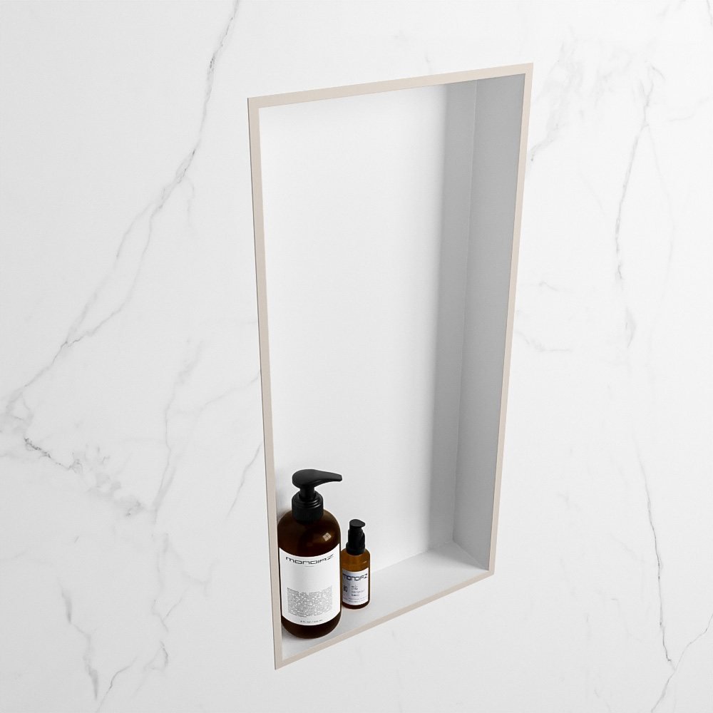 Deze nis heeft een elegante kleurencombinatie van linen (off white) en talc (mat wit), die moeiteloos samengaat met uw bestaande badkamerdecor. Het kleurenpalet voegt een vleugje verfijning toe aan uw ruimte, terwijl het minimalistische ontwerp zorgt voor een moderne uitstraling.
