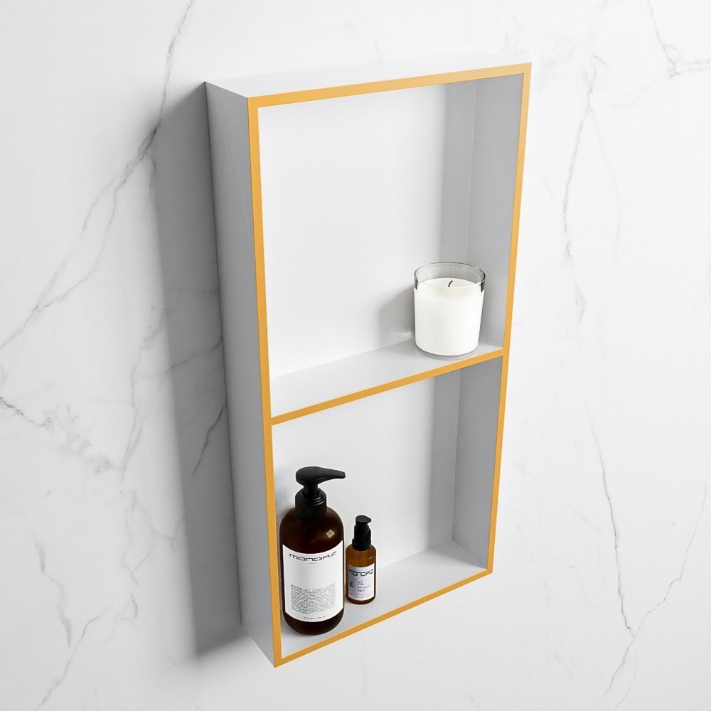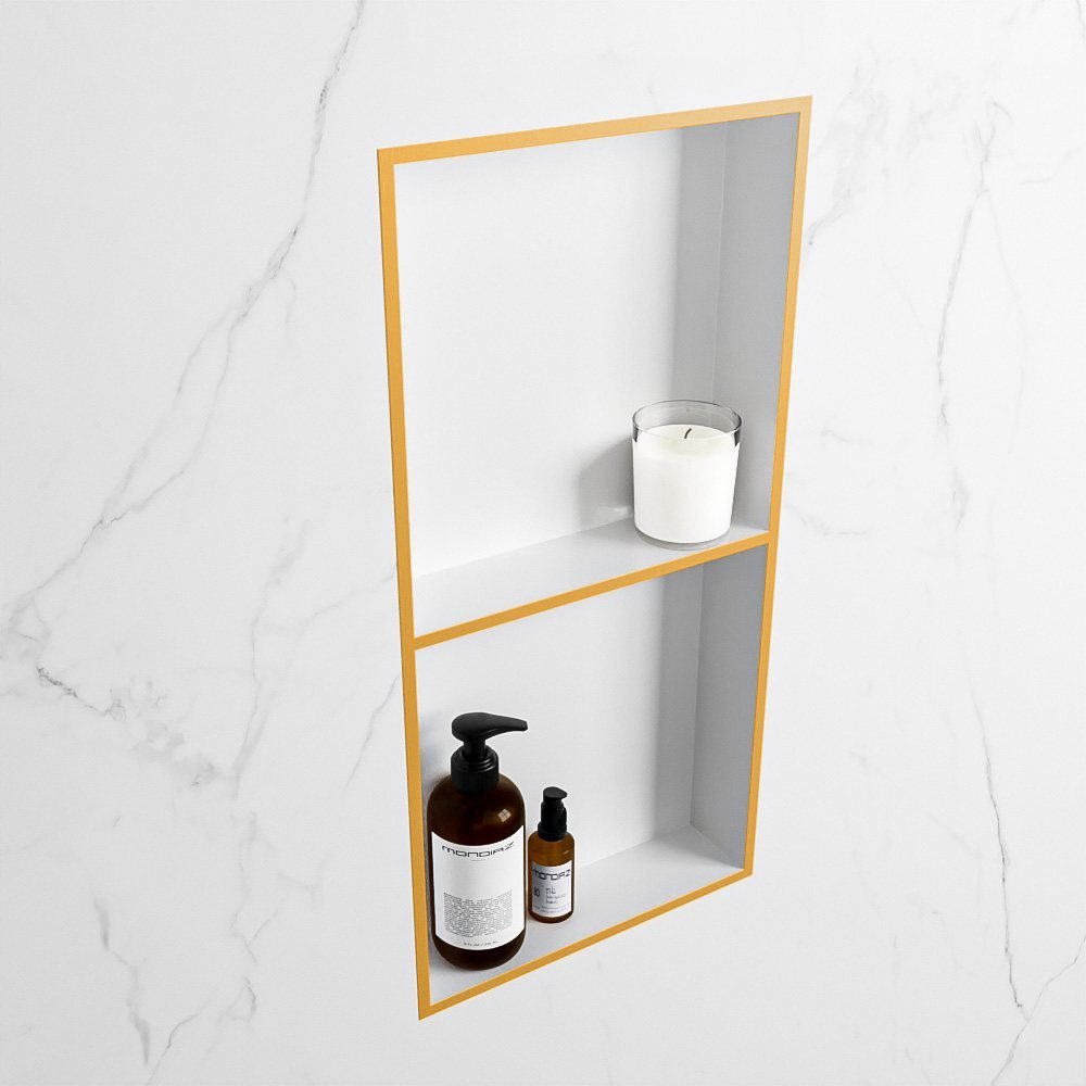 Voeg een vleugje elegantie toe aan uw badkamer met de Mondiaz EASY Nis. Deze nis, vervaardigd uit hoogwaardig solid surface materiaal, is niet alleen duurzaam maar ook makkelijk schoon te houden. Dankzij de stijlvolle ocher (geel) en talc (mat wit) kleurencombinatie, voegt deze nis een warme en uitnodigende touch toe aan uw badkamerinterieur.