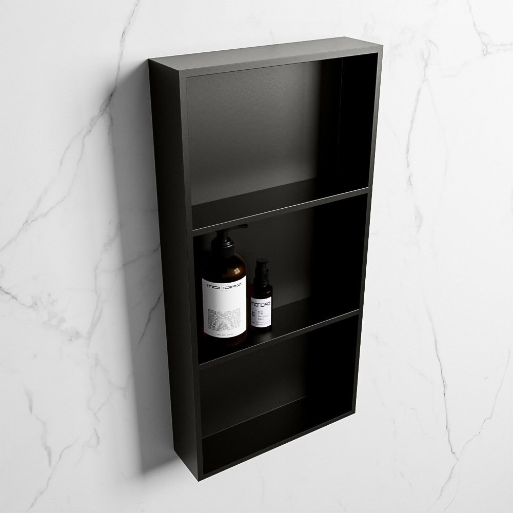 Met zijn drie vakken biedt deze nis voldoende ruimte om uw badkamerspullen netjes op te bergen en te organiseren. Het beschikt ook over een stijlvolle urban mat zwarte afwerking die perfect past bij moderne badkamerinterieurs.