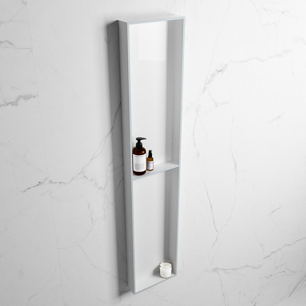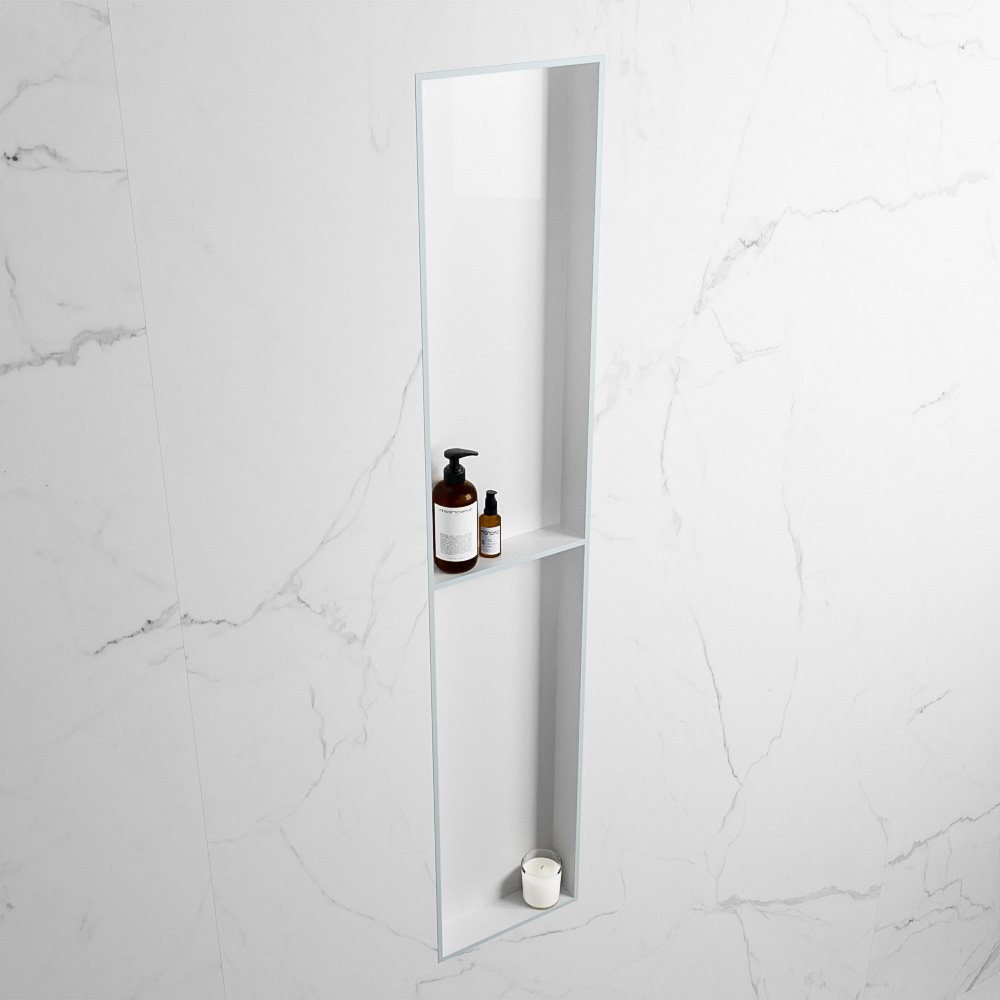 Gemaakt van het duurzame solid surface materiaal, is deze nis niet alleen stijlvol, maar ook uiterst praktisch. Het materiaal is gemakkelijk schoon te maken en behoudt zijn schoonheid door de jaren heen. De nis is verkrijgbaar in een clay (grijs tint) en talc (mat wit) afwerking, waardoor hij zich naadloos kan mengen met uw bestaande badkamerinrichting.