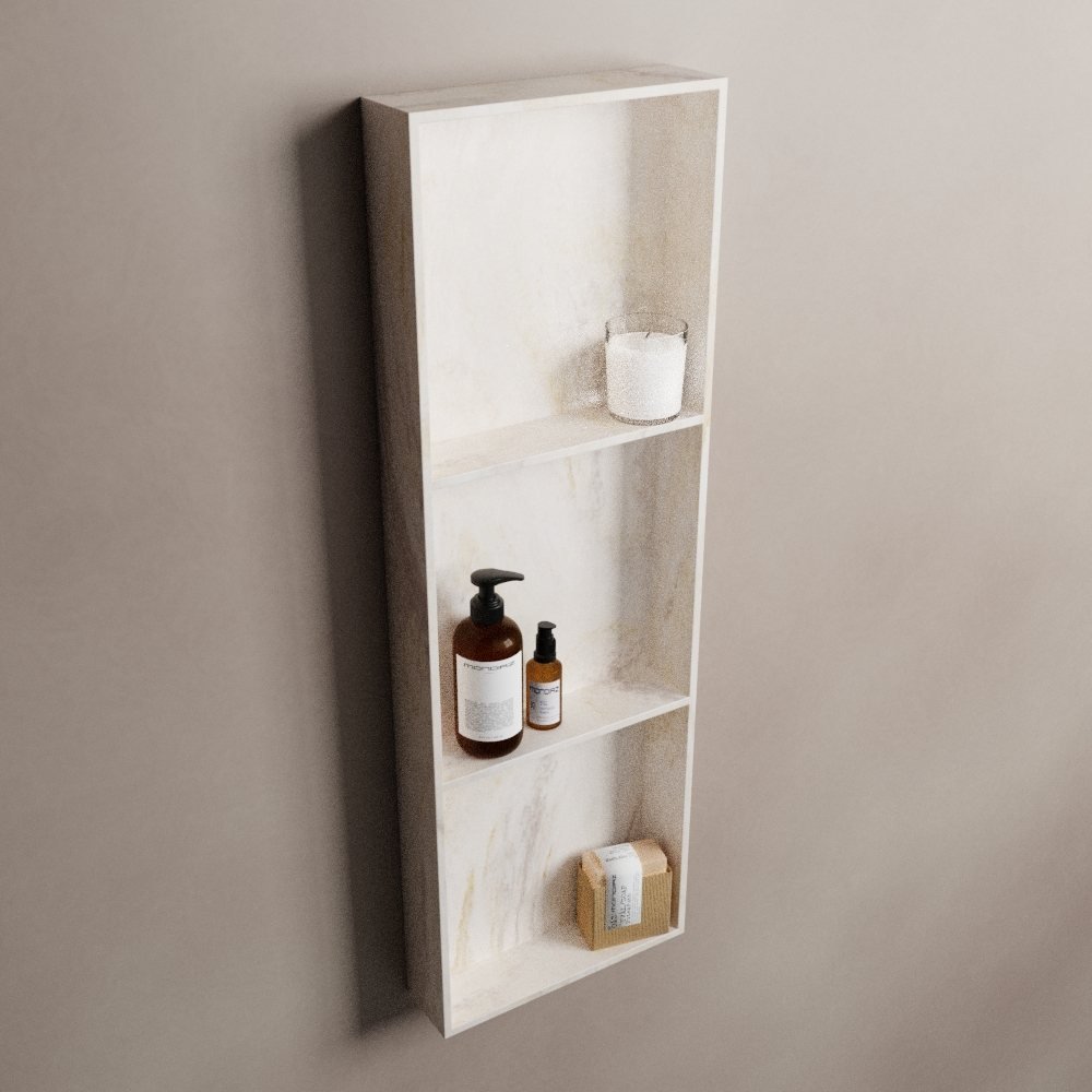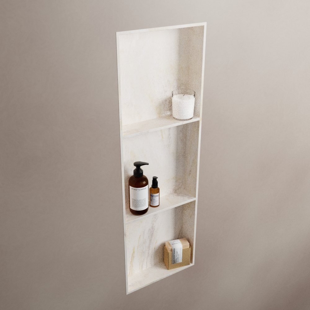 Deze prachtige nis kan zowel ingebouwd als opgebouwd worden, waardoor u de flexibiliteit heeft om het te installeren op de manier die het beste past bij uw ruimte en stijl. Het solid surface materiaal is niet alleen duurzaam, maar ook zeer hygiënisch en makkelijk schoon te houden. Het is bestand tegen vocht, warmte en alledaagse slijtage, waardoor het jarenlang meegaat zonder zijn schoonheid te verliezen.