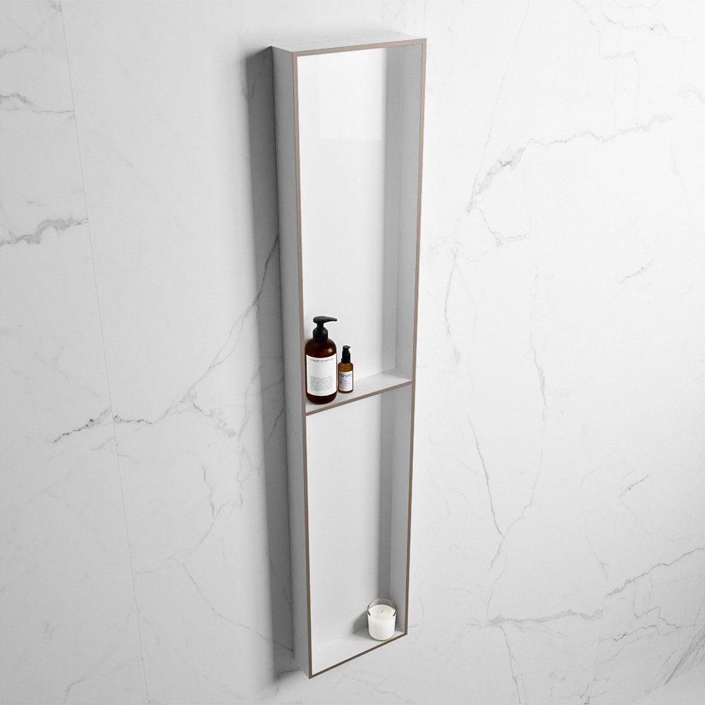 Met zijn afmetingen van 89.5×29.5cm en twee vakken biedt deze nis voldoende ruimte voor al uw badkamerbenodigdheden. Het tweekleurige design in smoke en talc geeft het een unieke uitstraling die gegarandeerd de aandacht trekt. De grijstint (smoke) en het mat wit (talc) passen perfect bij elk kleurenschema, waardoor deze nis een waardevolle aanvulling is op elke badkamer.