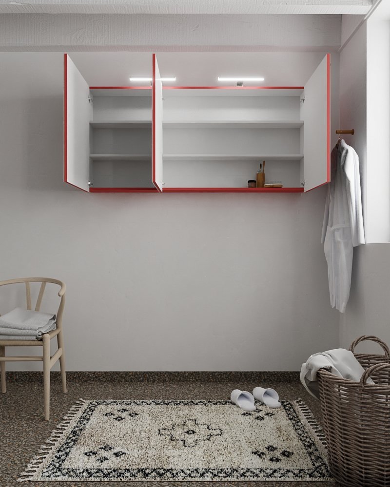 Met zijn vuurrode kleur zet deze spiegelkast een gedurfde toon en creëert een opvallend middelpunt in uw badkamer. Het kubusvormige ontwerp van de kast voegt een extra element van stijl toe, waardoor uw badkamer een unieke uitstraling krijgt die zeker indruk zal maken op uw gasten.