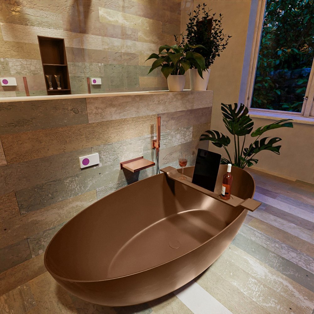 Dit bad, in een warme rust (bruin tint), is ontworpen om een gevoel van luxe en ontspanning te creëren. Het vrijstaande ontwerp geeft je de vrijheid om het bad overal in je badkamer te plaatsen. Of je nu houdt van een minimalistische, moderne stijl of een meer traditionele uitstraling, dit bad zal moeiteloos in je interieur passen.