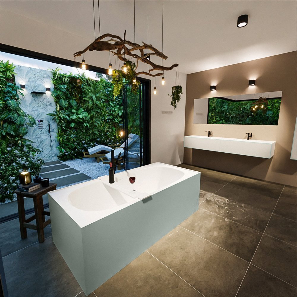 Het vrijstaande bad is afgewerkt in een unieke lichte pastelgroene en matte witte kleurencombinatie die een frisse en rustgevende sfeer in uw badkamer creëert. De lichte pastelgroene kleur voegt een zachte, natuurlijke tint toe die perfect samengaat met het matwitte oppervlak, waardoor het bad opvalt in uw badkamer.