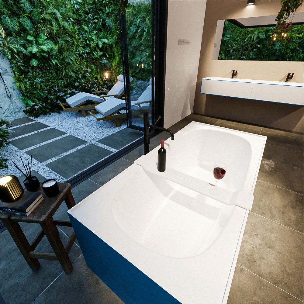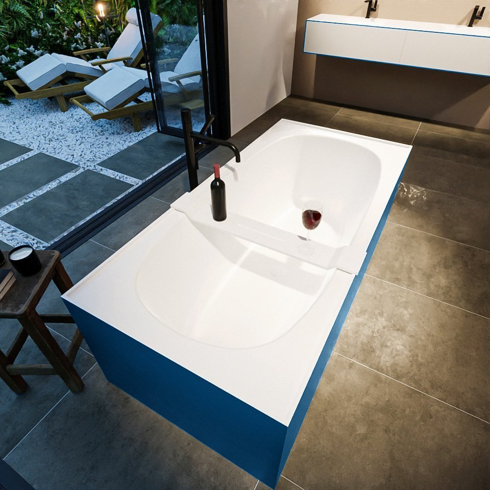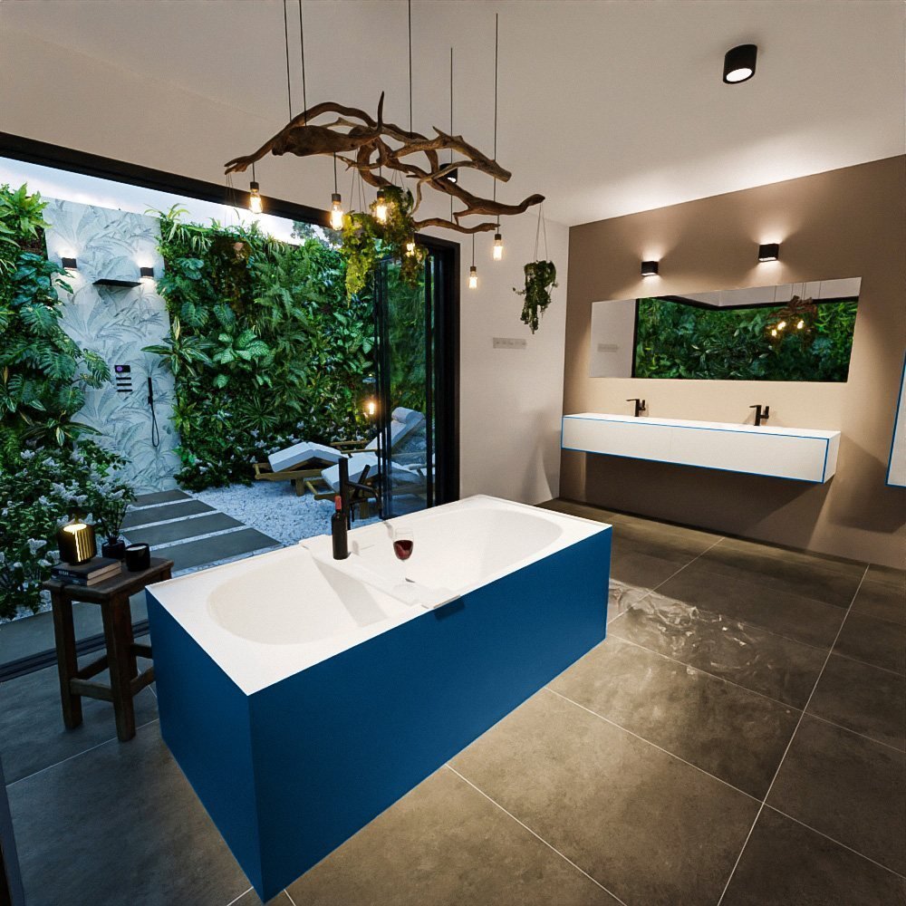 Met zijn unieke jeansblauwe en matte witte afwerking, voegt dit bad een vleugje elegantie toe aan uw badkamer. Het is niet alleen stijlvol, maar ook zeer comfortabel dankzij het royale formaat. U kunt heerlijk wegzinken in het diepe bad en volledig tot rust komen.