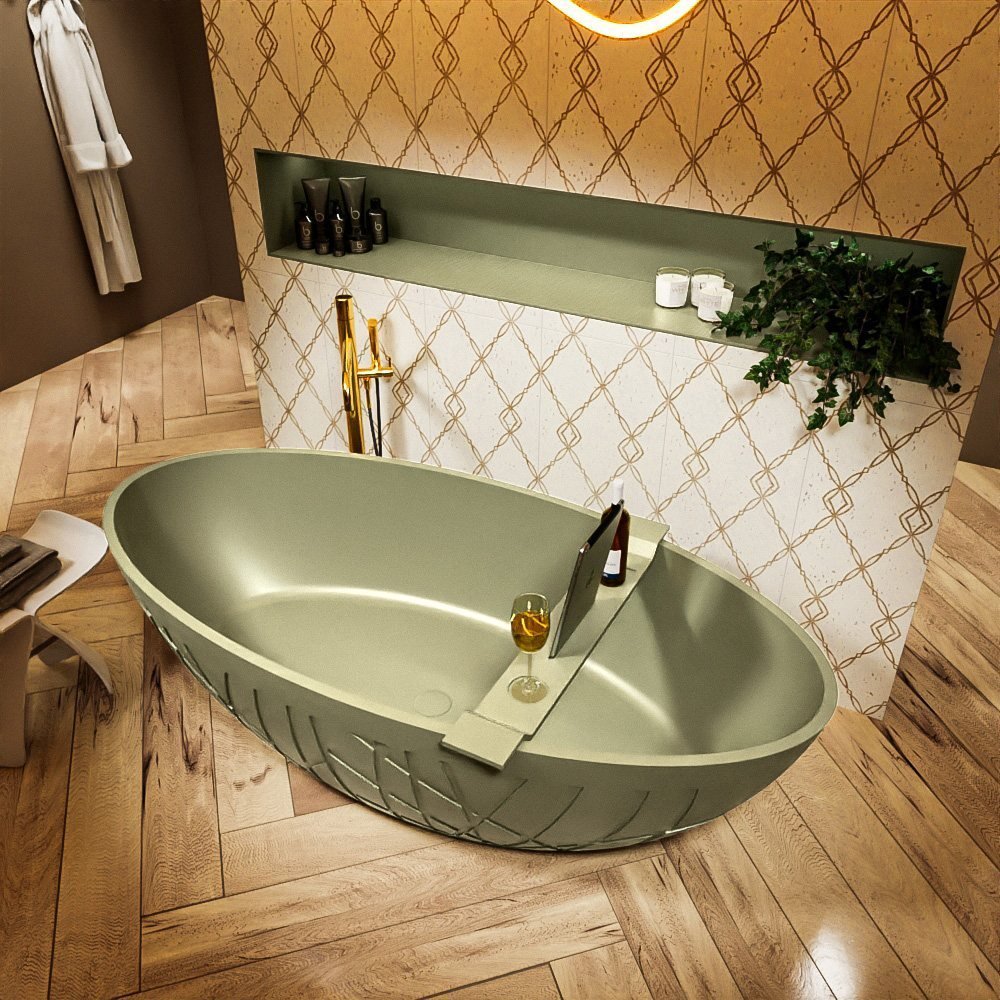 Het unieke aan dit bad is de opvallende legergroene kleur. Deze kleur voegt een stijlvol en eigentijds accent toe aan uw badkamer. Het simplistische ontwerp is gemakkelijk te reinigen en te onderhouden, waardoor het er altijd op zijn best uitziet.