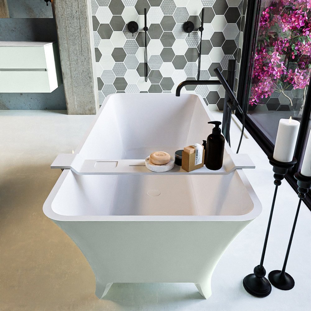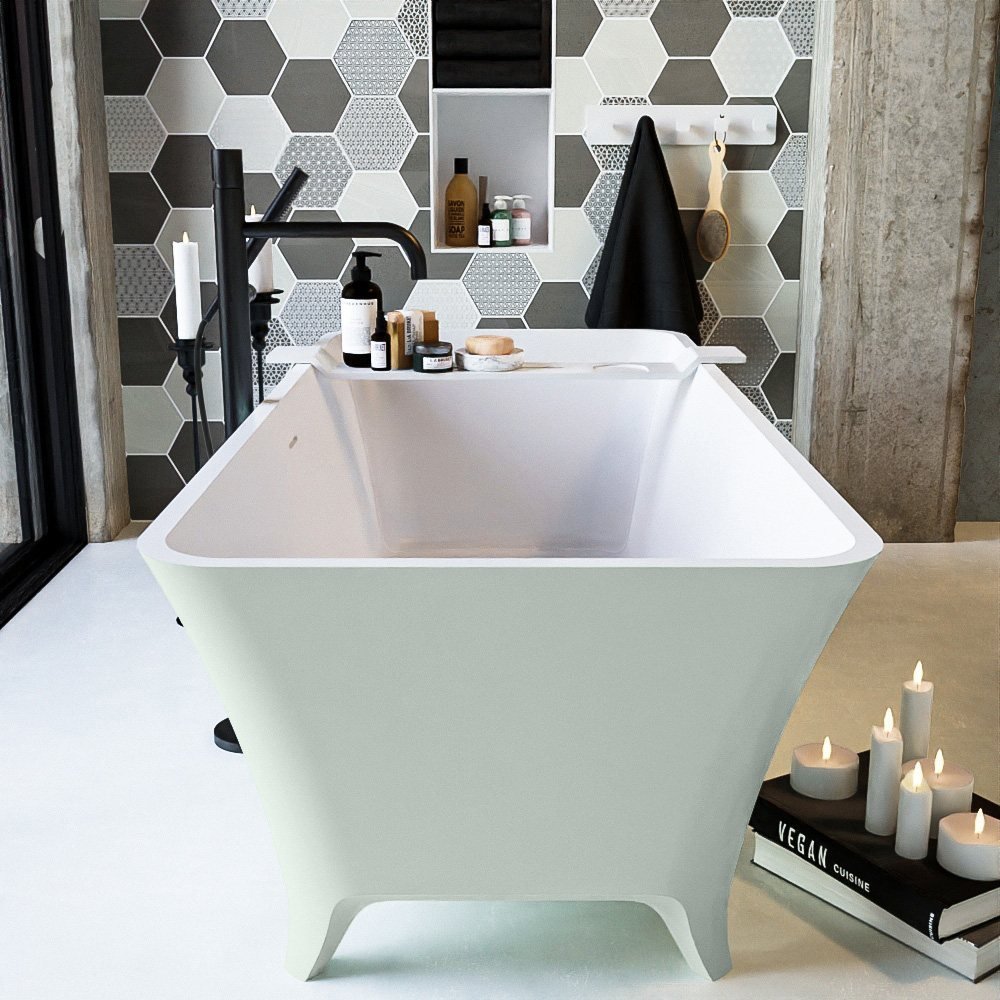 De perfecte combinatie van licht pastelgroen en mat wit zorgt voor een rustgevende en stijlvolle uitstraling. Dit vrijstaande bad is niet alleen functioneel, maar ook een prachtig decorstuk dat uw badkamer een gevoel van luxe en elegantie geeft.