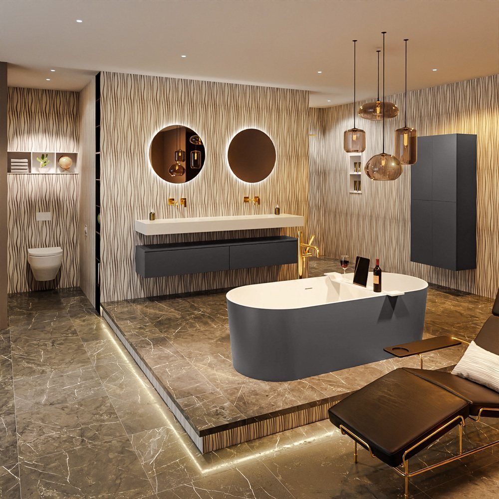 Dit bad is niet zomaar een bad. Het is een statement. Met zijn unieke donkergrijze kleur en mat witte afwerking, getuigt het van een sterk gevoel voor stijl en design. De moderne uitstraling van het bad combineert perfect met de warmte en comfort die het biedt. Bovendien is het vrijstaande design een hedendaagse trend in de badkamerwereld en zorgt het voor een ruimtelijk gevoel.