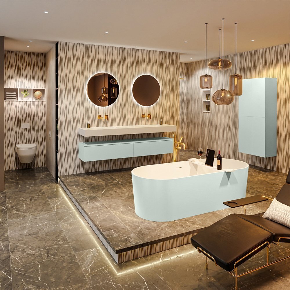 De Noble is niet zomaar een bad, het is een statement. Het licht pastelgroene en matte witte kleurenschema straalt een rustgevende sfeer uit, terwijl het vrijstaande ontwerp een gevoel van ruimtelijkheid en luxe geeft. Dit bad is ontworpen om te passen bij een scala aan interieurstijlen, van modern minimalisme tot landelijke charme.