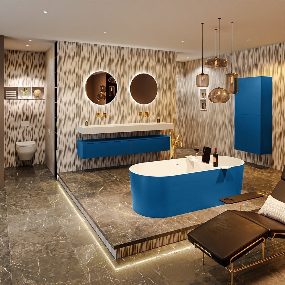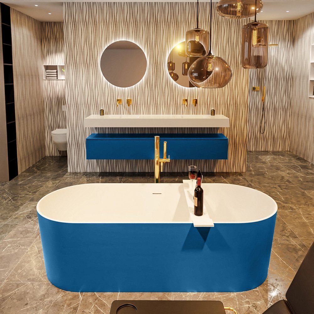 Creëer een luxe badkamerervaring met het Mondiaz Noble vrijstaand bad. Dit stijlvolle vrijstaande bad is een must-have voor elke moderne badkamer. Het unieke design met een jeansblauwe en matte witte kleurcombinatie voegt een frisse en eigentijdse uitstraling toe aan uw badkamer.
