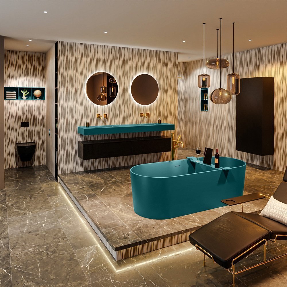 Met zijn unieke vormgeving is dit bad een echte blikvanger in elke badkamer. Het vrijstaande ontwerp biedt u de flexibiliteit om het bad te plaatsen waar u maar wilt. Bovendien voegt de jade groene afwerking een vleugje kleur toe aan uw ruimte, waardoor de badkamer een verfrissende uitstraling krijgt.
