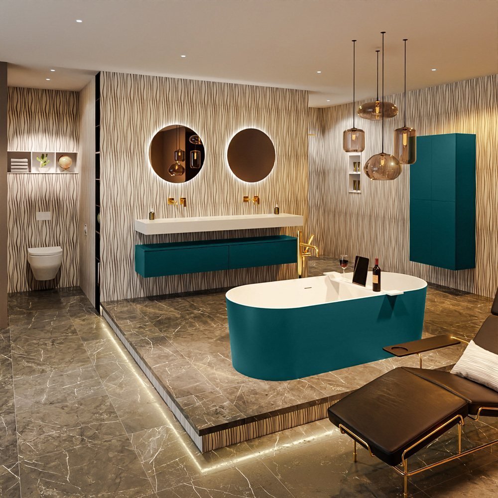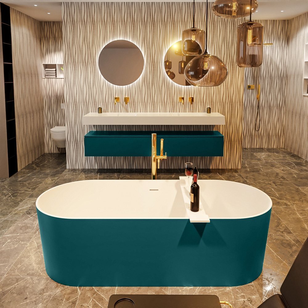 Het Noble vrijstaande bad van Mondiaz straalt elegantie en luxe uit. De unieke kleurencombinatie van jade groen en mat wit geeft het bad een verfijnde uitstraling die bij verschillende interieurstijlen past. De royale afmetingen van het bad zorgen voor voldoende ruimte om te ontspannen na een lange dag.