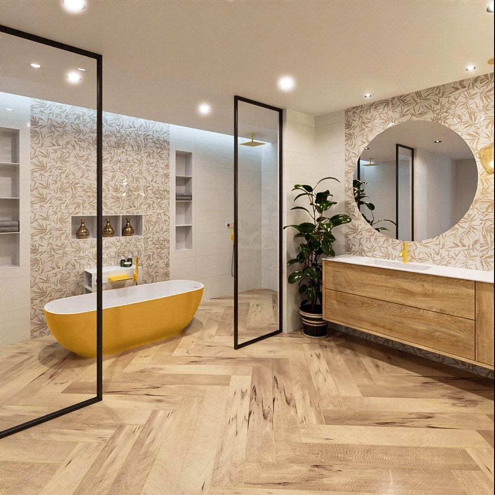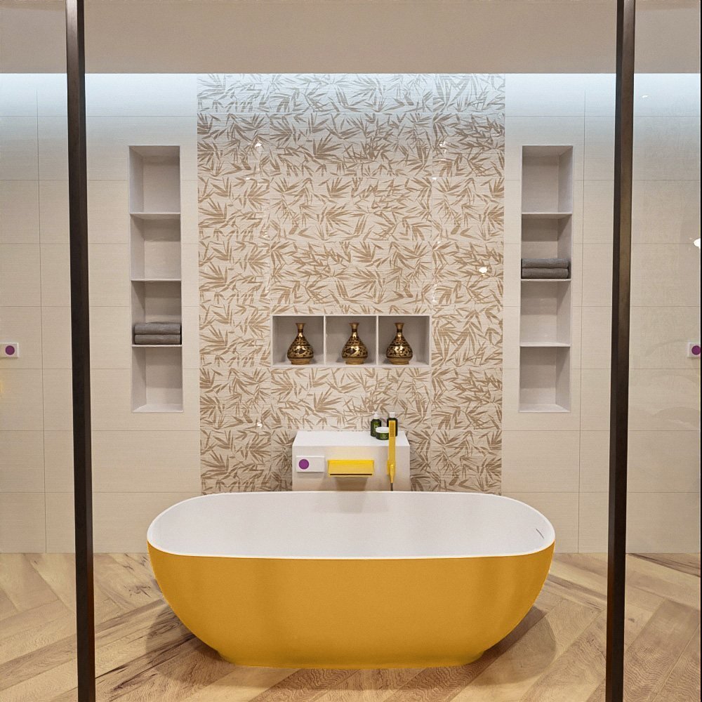 - De combinatie van ocher en talc kleuren geeft het bad een unieke uitstraling