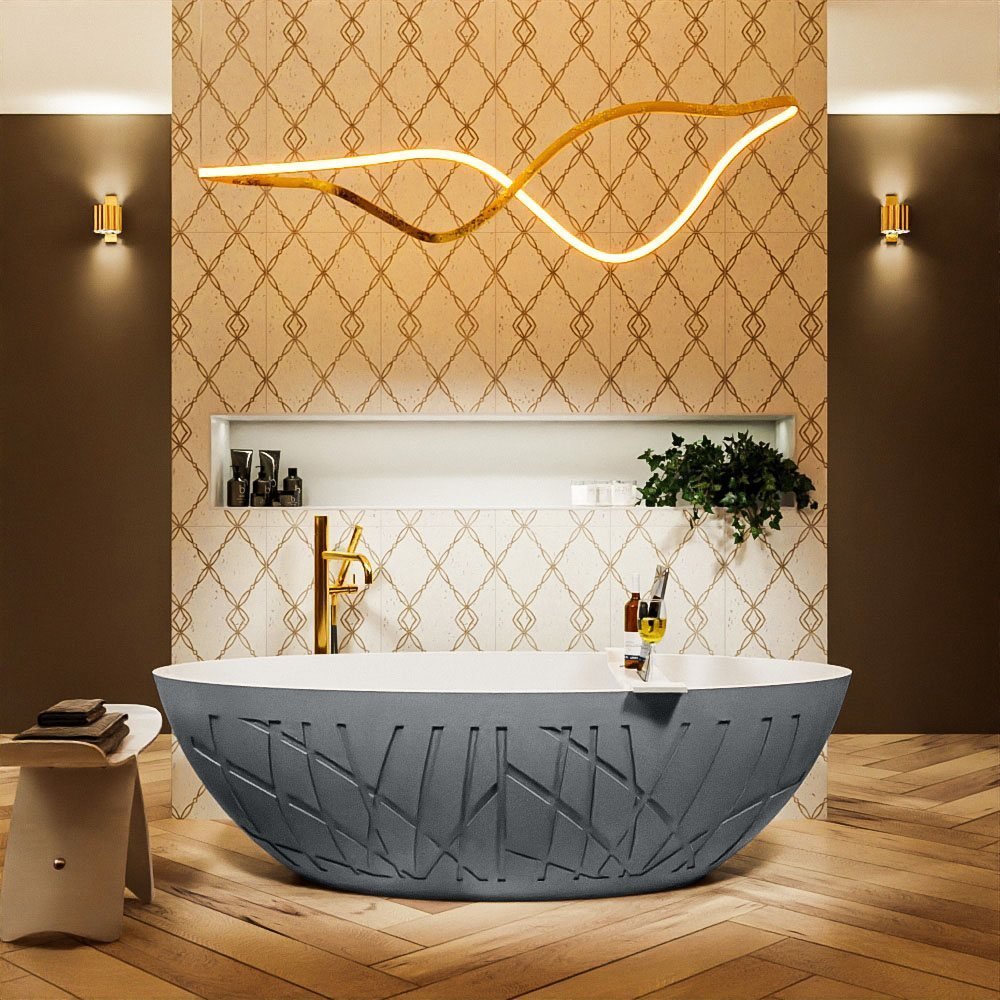 De zilveren kleur en strakke lijnen van dit bad geven het een verfijnde uitstraling. Het vrijstaande ontwerp is een statement op zich en voegt een vleugje luxe toe aan elke badkamer. Met zijn ruime afmetingen van 180x85cm, biedt dit bad voldoende ruimte voor een ontspannende badervaring.