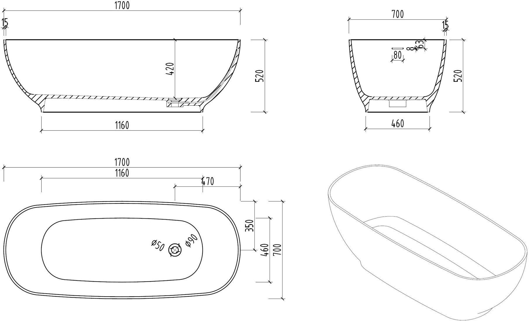 • Het bad biedt een ruime afmeting van 170x70cm, ideaal voor een ontspannend bad