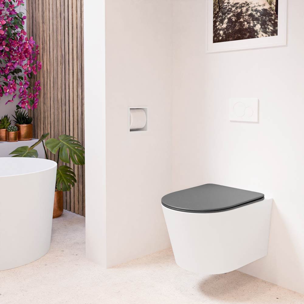 Het ontwerp van dit toilet is zowel modern als minimalistisch, met een donkergrijze afwerking die perfect past in elke moderne badkamer. De matte witte kleur, genaamd Talc, voegt een subtiele elegantie toe aan uw badkamerinterieur. Bovendien wordt het toilet geleverd met een bijpassende toiletzitting, zodat u geen extra aankopen hoeft te doen.