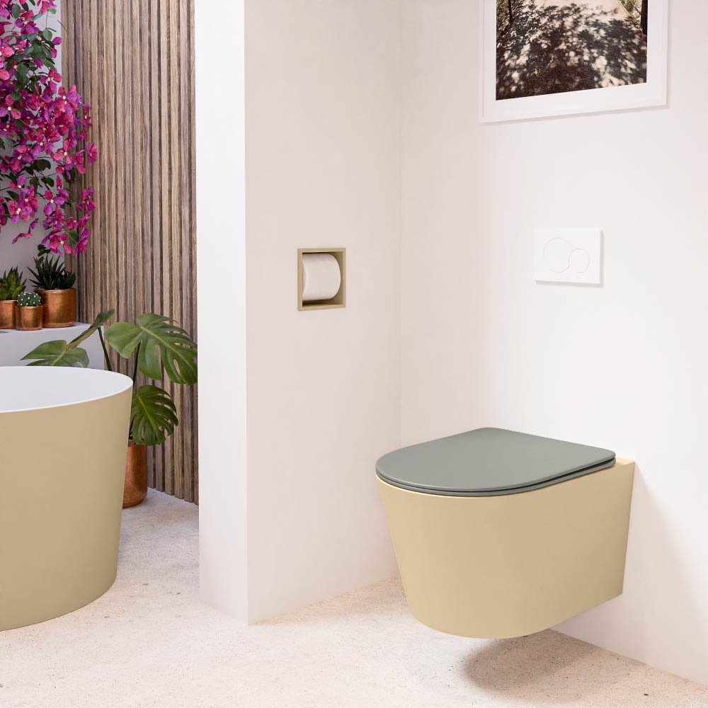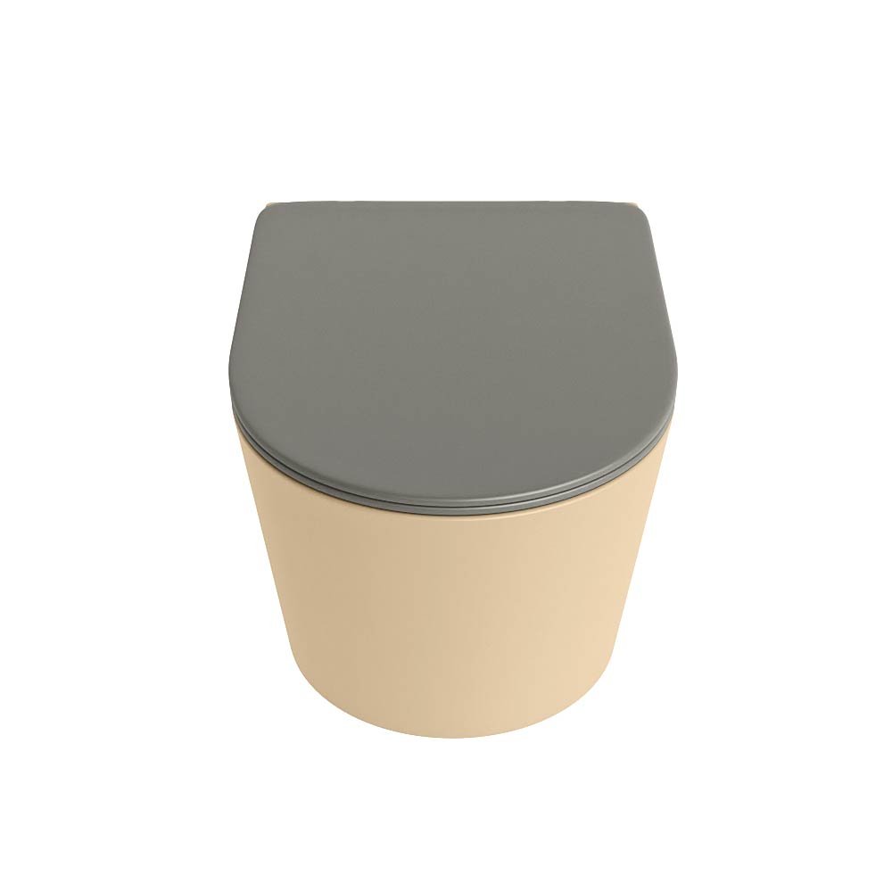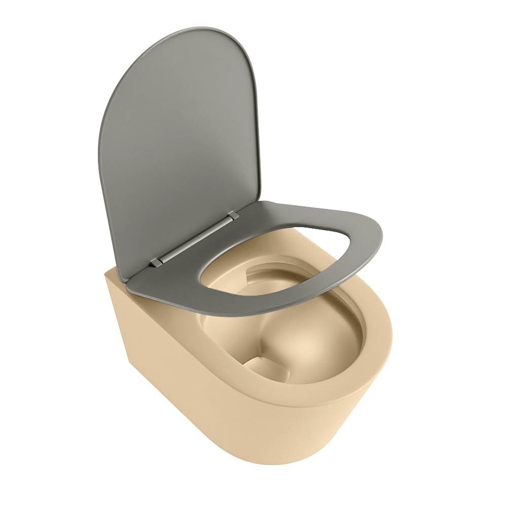 Het gebruik van keramiek in het ontwerp van het toilet biedt een hoge mate van duurzaamheid en een lange levensduur. Het ontbreken van een spoelrand maakt het schoonmaken eenvoudig en houdt het toilet hygiënisch. De elegante zandkleurige afwerking en de bijgeleverde rookkleurige toiletzitting voegen een stijlvol tintje toe aan uw badkamer.