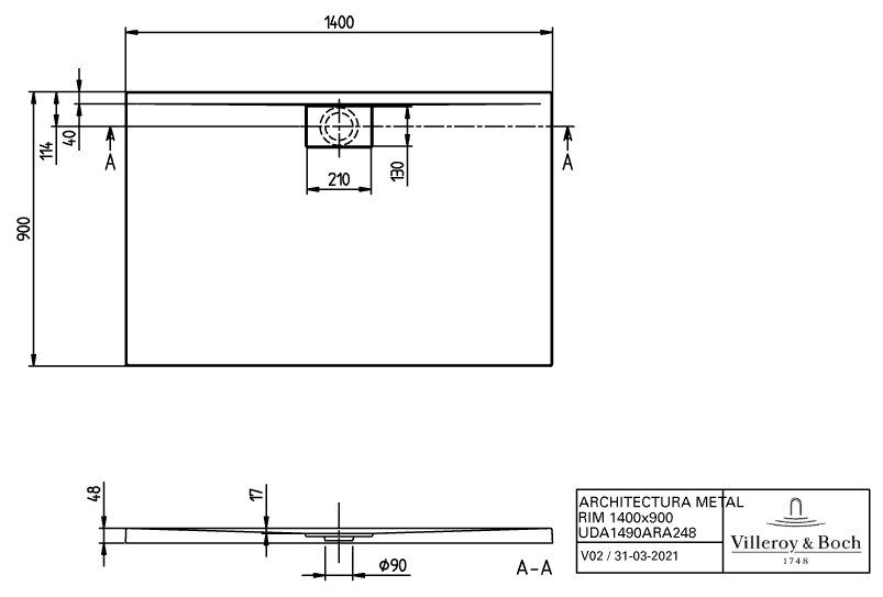Villeroy & Boch Architectura Metalrim kunststof douchebak – acryl rechthoekig 140x90x4.8cm – mat wit – uda1490ara248v-rw